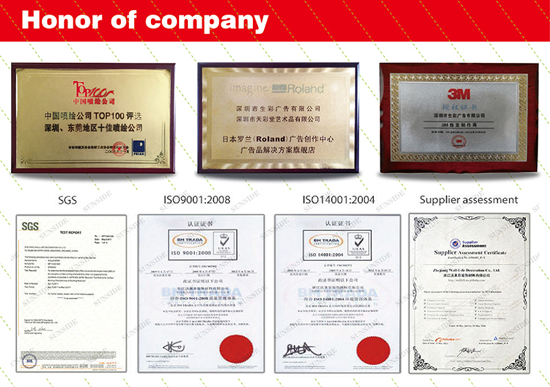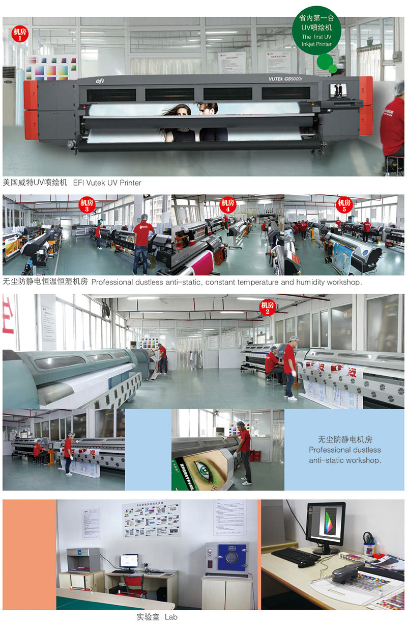 Production equipment: We have 36 sets inkjet printer of Japan Roland, 12 sets large format printer of Japan Seiko, 8 sets original import high precision inkjet printing EPSON machines, 3 sets America EFI VUTEK UV Machines,2 sets OCE Flat Plate UV Printing machines, 5 sets Roland heat transfer digital printing machine,12 sets Automatic processing equipment .