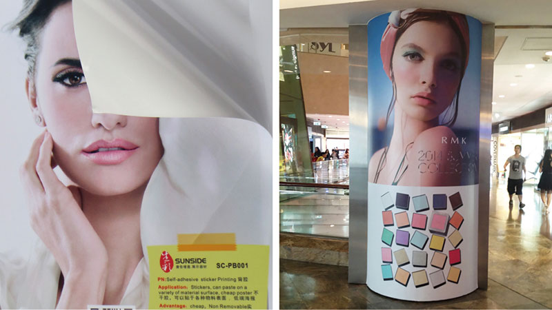 應用:不干膠貼紙,可以貼于各種物料表面,但不容易去除膠漬,是低端的海報解決方案。