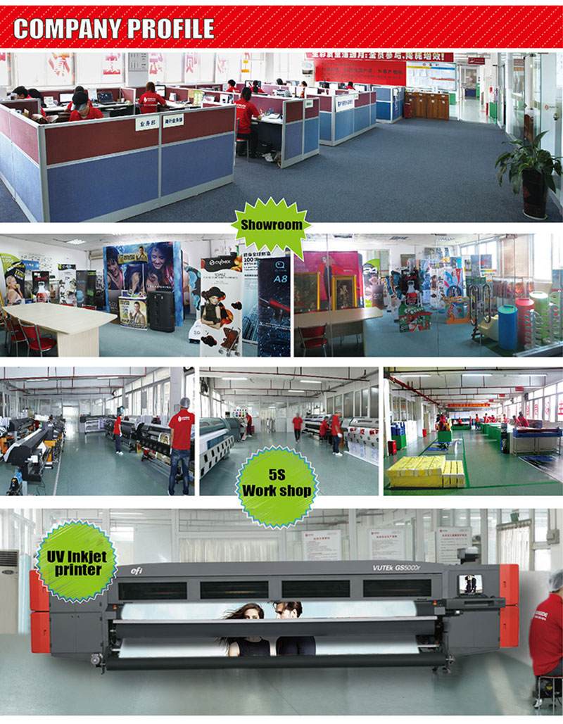 We are located in Shenzhen, China. The factory was established in 1997. It has 90 employees and a 5,000-square-meter workshop.We specialized in Advertising Printing&Display equipment products oversea business,the core parter of Japan Roland.