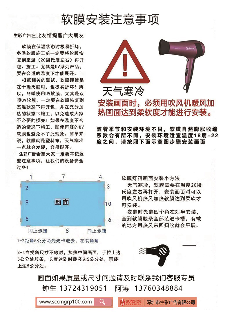 天氣寒冷,軟膜需要再溫度20攝氏度左右再打開,安裝畫面時可以用吹風(fēng)機(jī)熱風(fēng)加熱軟膜達(dá)到柔軟才可安裝。